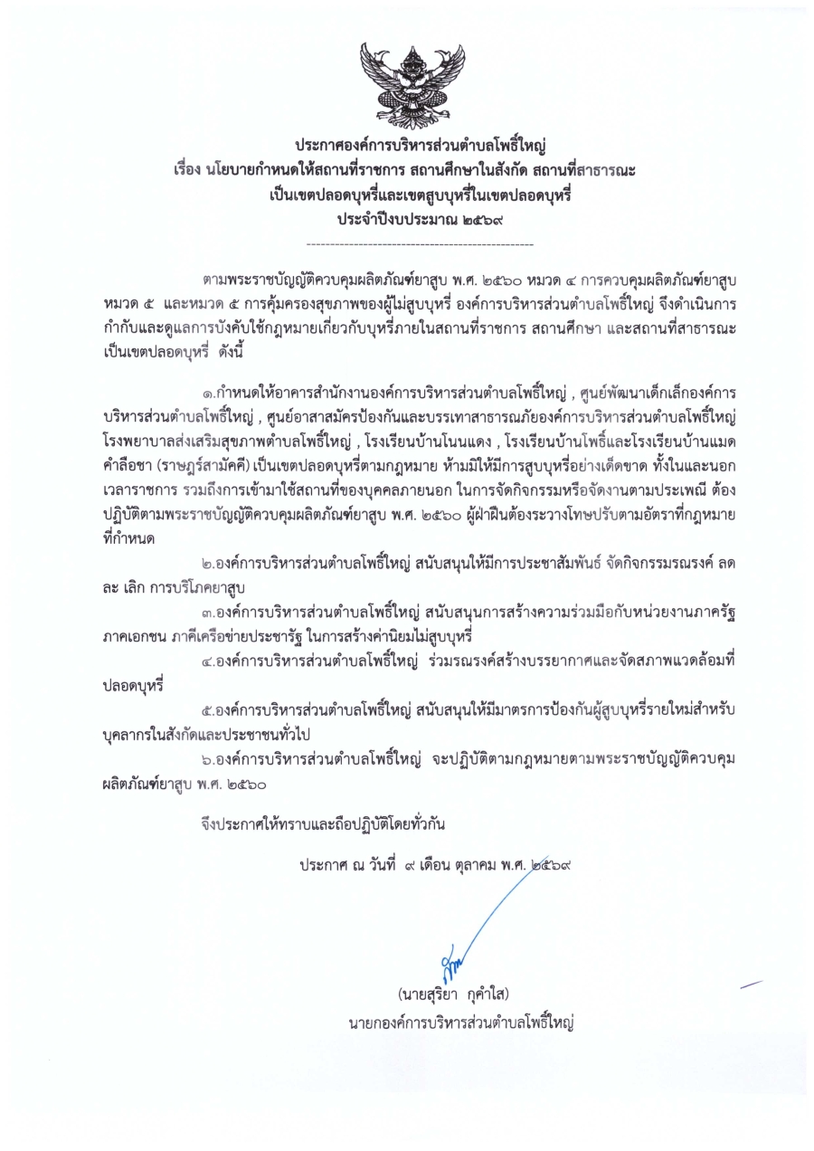 ประกาศ เรื่อง นโยบายกำหนดให้สถานที่ราชการ สถานศึกษาในสังกัด สถานที่สาธารณะ เป็นเขตปลอดบุหรี่และเขตสูบบุหรี่ในเขตปลอดบุหรี่ ประจำปีงบประมาณ 2569
